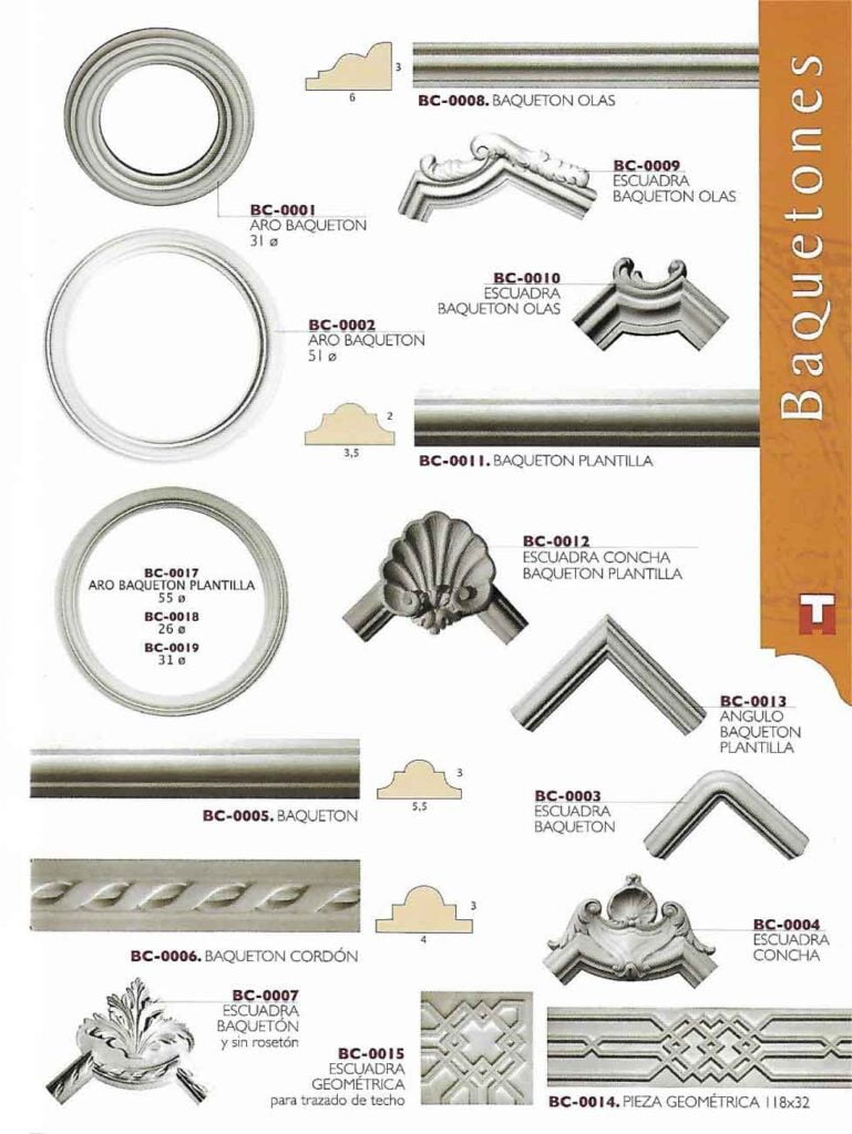 En Toledano Art, te ofrecemos una exclusiva selección de baquetones de escayola, elaborados artesanalmente con materiales de alta calidad. Nuestros diseños, que van desde estilos clásicos hasta contemporáneos, son ideales para realzar la estética de techos, paredes, puertas y ventanas. Explora nuestro catálogo y encuentra el baquetón perfecto para tu proyecto de decoración o restauración.
